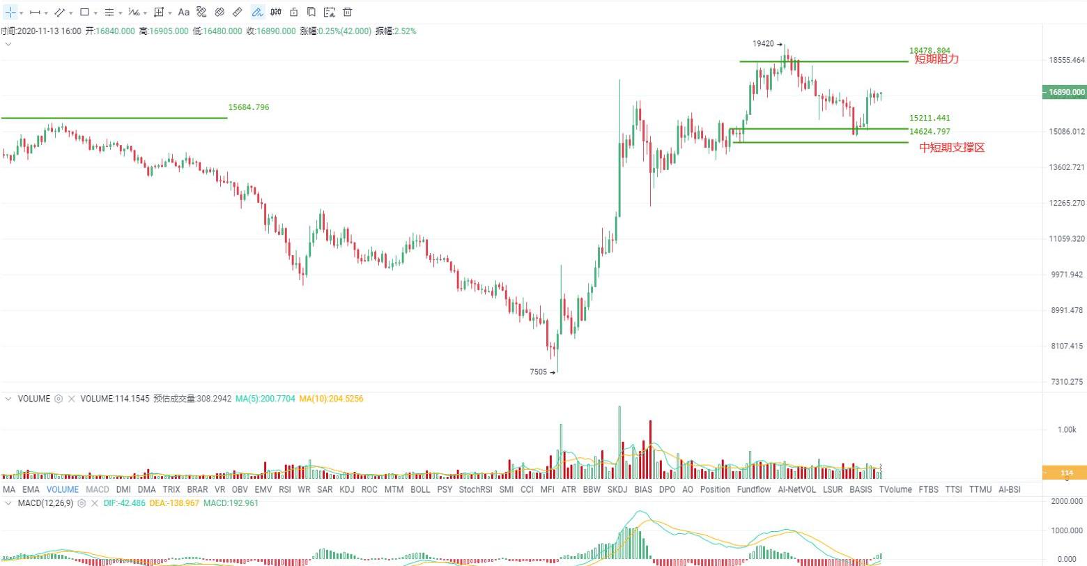 不過雖說現在趨勢都保持的完好,但畢竟沒有只漲不跌的商品,而且在成交量和MACD指標上都存在頂背離現象,所以對于沒有成本優勢的場外等待進場的資金來說,多一分謹慎沒壞處,只要你的本金在還愁沒有好的買入機會。建議可以依次關注以下支撐:16100、15800、15400,支撐力度也依次增強,如果出現下跌,當幣價在觸及這些潛在支撐中的任意一個且出現明顯止跌信號