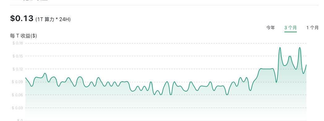根據標準共識BTC挖礦收益指數顯示最近24小時,每T算力收益為$0.13,創近三個月新高,挖礦收益極大程度的推動了礦工挖礦熱情。
