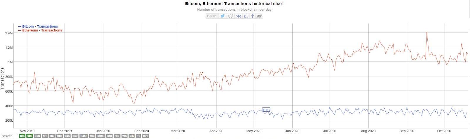 然而,在8月的DeFi熱潮中,以太坊的每日交易量增加了30%,在8月10日達到了兩年來的最高點129萬枚。在同一時期,比特幣交易量持續徘徊在30萬和35萬枚之間,這主要表明以太坊生態系統吸引了新的加密用戶。