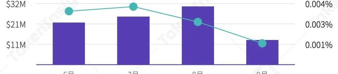 9.?有待考量?去中心化交易所衍生品交易熱度在八九月份逐漸降低,其交易量受到整體衍生品市場的影響。dYdX合約產品成交量占其總成交量較上線時下降6%,去中心化交易所合約產品短期內的實際市場需求有待考量。