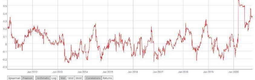 由于美中貿易緊張局勢、伊朗矛盾升級以及市場對COVID-19的擔憂,比特幣和黃金之間相關性似乎在增加。當前比特幣與黃金之間的相關性處于歷史高位,這表明比特幣可能比以往發揮了更多地避險功能。