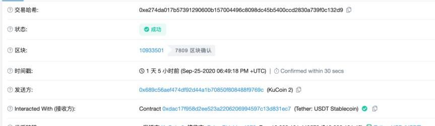 從交易記錄來看,該地址首筆入賬交易發生于北京時間9月26日02:49:18,該交易即竊取了超過1388萬枚ERC20USDT。