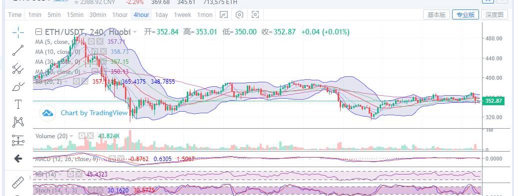 日內以太坊跟大餅行情類似,跌勢觸及345位置附近反彈,目前價格回到350上方區域,行情波動逐漸平緩,價格反彈不強。
