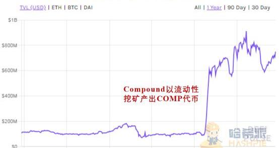 市場六月份的暴漲離不開借貸協議Compound的功勞。該項目自6月16日宣布以流動性挖礦產出治理代幣COMP后,提供該幣種交易的二級市場迅速從去中心化交易所蔓延至中心化交易所,包括Poloniex、Coinbase、幣安在內的70多家交易平臺相繼添加對COMP的支持,代幣產出不到一周時間就實現逾3.29倍增長。隨后近一個月時間里,Compound更是引來超10億美元的鎖倉量,相關數據的增長數值比2020年年初整個DeFi市場的總鎖倉量還要高出48個百分點。