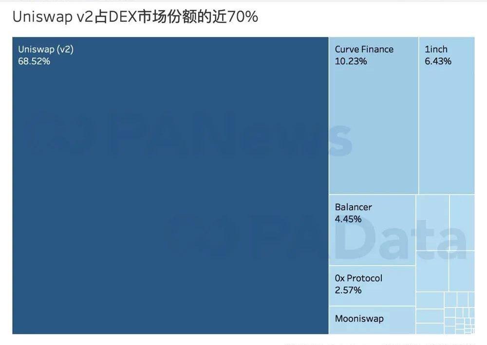 根據CoinGecko的數據,截至9月1日,46個DEX平臺的單日名義交易量約為11.29億美元,其中,Uniswap以超7.73億美元的交易量占據了68.52%的市場份額。其次是穩定幣交易平臺Curve,日名義交易量約為1.15億美元,占DEX市場的10.23%。日名義交易量超過1000萬美元的還有1inch、Balancer、0xProtocol、Mooniswap、Kyber、Tokenlon和Synthetix,其市場份額都在1%以上。
