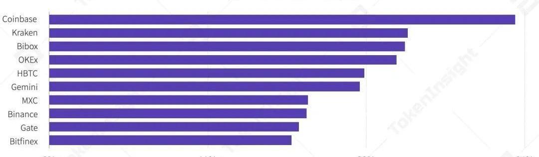 在已上線DeFi通證的交易所中,有包括OKEx、Huobi、Gate和MXC在內的4家上線幣種達40種以上。同時,Coinbase和Kraken雖然只上線了10種DeFi代幣,但從上線DeFi通證占交易所總上線代幣數量來講位居前列。在所有交易所中,上線代幣總量和DeFi代幣數量均較多的有OKEx、Binance和Gate,而代幣總量一般但DeFi代幣占比較高的有HBTC。此外,在專注于某一市場的交易所中,ZT交易所在上線DeFi上表現地較為積極,已上線的DeFi代幣達41種。
