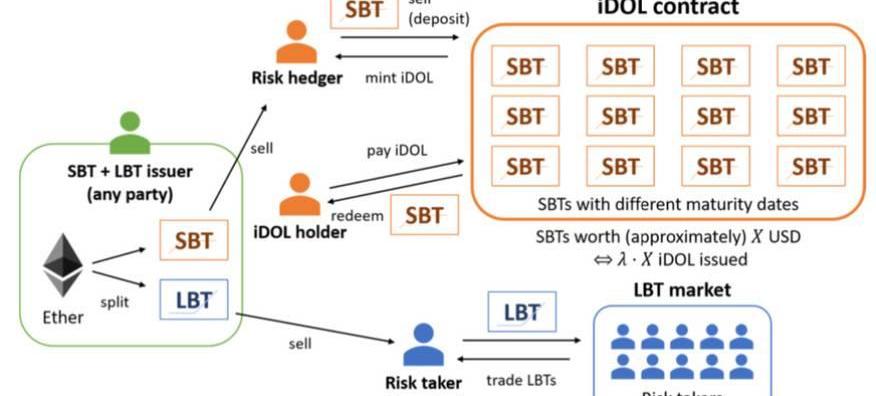 在Lien體系內可以使用ETH鑄造LBT、SBT兩種資產。LBT是波動資產,承擔ETH下跌的全部風險,適合高風險偏好人群持有。SBT是穩定資產,不承擔風險,價格不會波動,所以可以使用SBT生成穩定幣iDOL,SBT和穩定幣之間可以無滑點兌換。