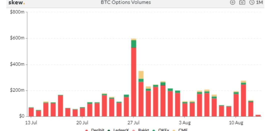 對于期權合約而言,目前在加密貨幣市場中仍然處于剛起步階段,能提供期權合約交易的交易所也屈指可數。根據?Skew?網站提供的數據可知,目前僅有?Deribit、LedgerX、Bakkt、OKEx以及CME交易所的期權交易量數據進行收錄,總交易量與期貨合約交易量相比極少。以上交易所提供的均為?T型報價標準期權,因此對于流動性的需要極高。