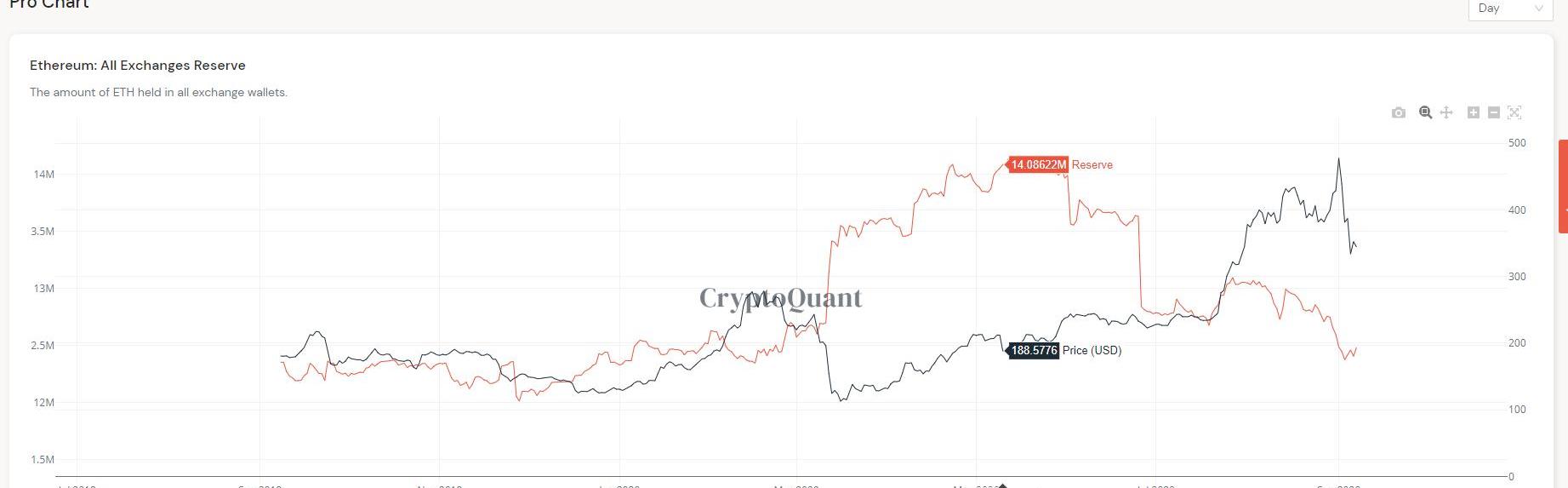 從CryptoQuant提供的所有交易所錢包中的以太坊儲備數量看,5月12日,該數值在141.4億美元,