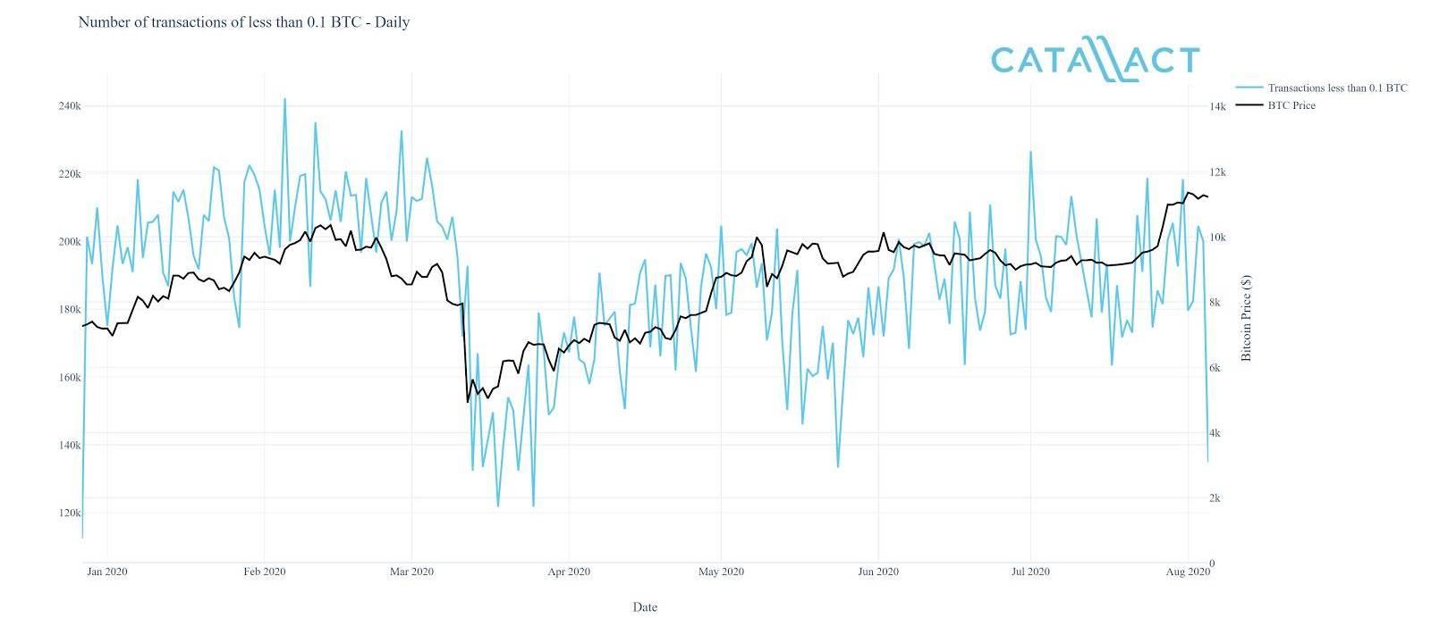 5月份比特幣價格觸及1萬美元后,每日小額比特幣交易量減少,人們采取觀望態度??來源:Catallact