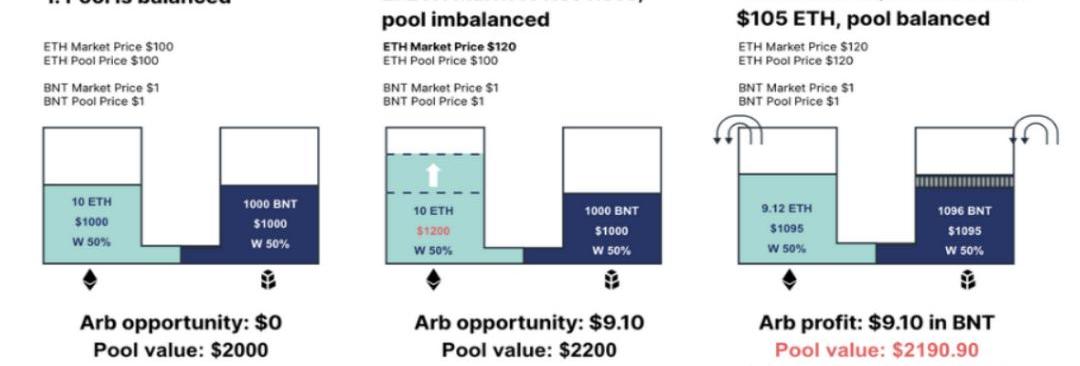 Bancor使用Chainlink預言機,而不是依賴套利來平衡AMM價格與市場價格。池中每一項資產的權重將根據預言機的最新價格進行調整,同時消除套利機會,保護流動性提供者的資產價值。