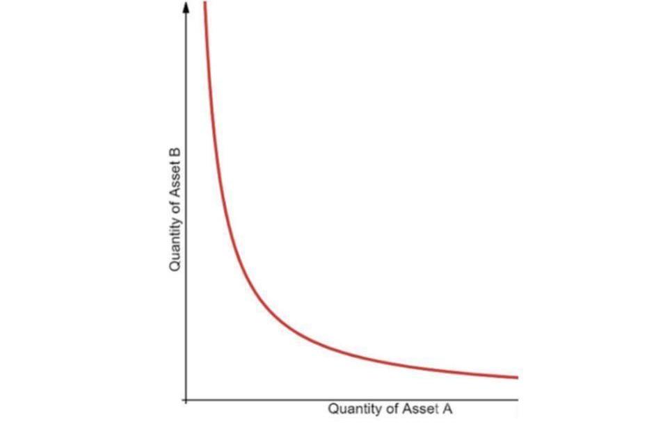 算法型去中心化交易所則是利用?自動做市商?(AutomatedMarketMakers)來模仿做市商的報價行為。常見的做市商算法為恒定乘積做市商及其函數衍生的算法。?恒定乘積做市商?由Bancor及Uniswap采用,其機制如下: