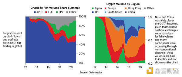 我們嘗試確定為什么持有比特幣的另一種方式(無論是作為財富的存放還是出于更多投機目的)是查看交易額,與黃金相比,比特幣的高交易額可能反映了其相對投機性。而與比特幣相比,黃金的交易額占未償還總資產的百分比幾乎微不足道,之所以會出現這種現象,部分原因是世界各地的中央銀行都擁有大量黃金總供應量,并將其作為長期價值儲備。另一方面,由于高頻交易者的出現,繁榮的衍生品市場、以及與比特幣進行交易的其他代幣數量激增,近年來比特幣交易額激增。再加上不受監管的加密貨幣交易所報告交易量數據存疑,也給市場造成了流動性增加的錯覺。實際上,這種流動性除了存在長期流動性風險之外,也更多地代表比特幣交易存在高流失率和投機性問題。