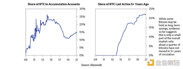 雖然很難直接確定相關情況,但是下面的圖表顯示了用作儲蓄的比特幣份額的兩種方式。具體而言,一個是比特幣在累積帳戶中所占的份額,另一個是比特幣在超過5年的“最新活躍”帳戶中所占的份額。累積賬戶是只購買了比特幣而未售出任何賬戶的賬戶,而“上次活躍”的代幣是長期投資者和很可能損失的代幣的混合體。我們看到,雖然自2018年以來,長期持有比特幣的用戶數量有所增加,但他們的總份額仍然很小(約為15%)。而且,盡管相當一部分比特幣在5年以上都沒有動靜(超過20%),但大部分比特幣供應量仍處在活躍或半活躍的流通狀態中(建議進行更多的投機交易)。