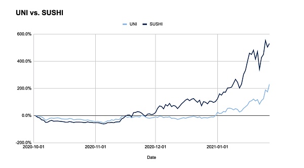 今天來看,自 2020 年第四季度開始,Uniswap 的漲幅已經飆升到 232%,而 Sushiswap 則在大家都以為它死了之后,以 530% 的漲幅重新爆發。