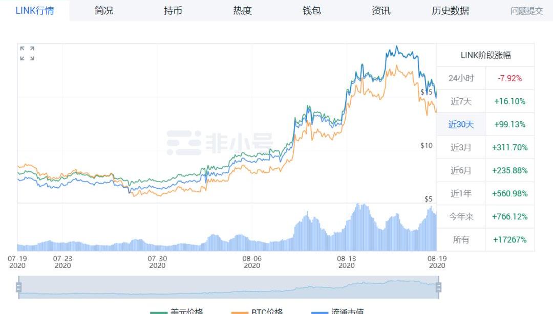 從3月初到8月初,去中心化預言機ChainLink的DeFi代幣LINK的價格從最低的1.366美元漲到了14.414美元,漲幅高達955%,月均上漲191%,年內價格漲超10倍。
