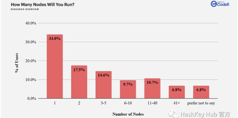 另外就是那些不足32個的想參與質押服務的,可以通過staking服務商的類似「合并賬戶」的服務進行質押,所以最終的質押率不會太低。Consensys做了份調查,那些愿意自己做validator的用戶,預期自己跑的節點數量,可見一個用戶跑多節點的情況會很常見。