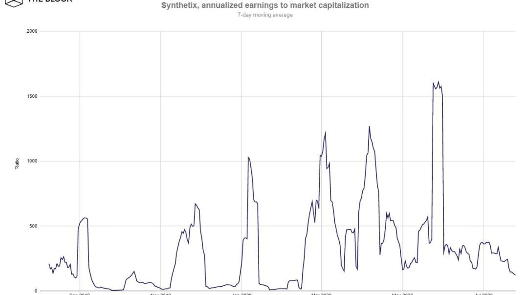 “代幣持有者需要對自己提供的服務負責”的想法也擴展到了金融加密協議中。Augur代幣的持有者會被支付一筆報告費,在協議的第一個版本中,平均報告費為1.26%。這個報告費必須足夠高,才能激勵用戶正確的報告市場結果。SNX代幣持有人為Synthetix上的市場提供流動性,并確保有足夠的抵押品使系統具有償付能力。作為交換,他們能獲得0.3%的交易費用。這也使得計算這些協議的歷史收益倍數變得簡單明了。