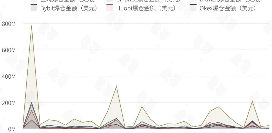 每日全市場爆倉金額和全市場杠桿水平以及漲跌幅度相關。多空博弈激烈的情形下,全市場杠桿水平增加、漲跌幅度變大,從而導致每日爆倉金額增加。