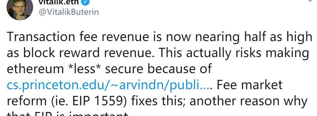 V神專門針對手續費用不斷飆升的現狀發推,稱目前以太坊礦工的收入結構中交易費收入已接近區塊獎勵的一半,這可能威脅以太坊的安全性,同時他強調“針對費用市場的提案可解決這一問題”。