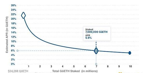 而對于參與以太坊抵押,作為驗證著獲取獎勵,官方也給出了一個曲線供用戶理解。如果質押的ETH不多,年度獎勵就很高,但是隨著總數的增加,每個驗證者收到的獎勵就開始下降。
