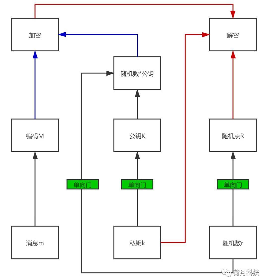 如圖所示,藍線為簽名所需要的數據,經過單向門的數據可被隱藏,未經過單向門的數據需要小心處理;紅線是驗簽的數據,這些數據是要傳給解密者或者解密者本身持有的。解密流程中私鑰為解密方單獨持有,隨機數和消息由加密方生成和提供。