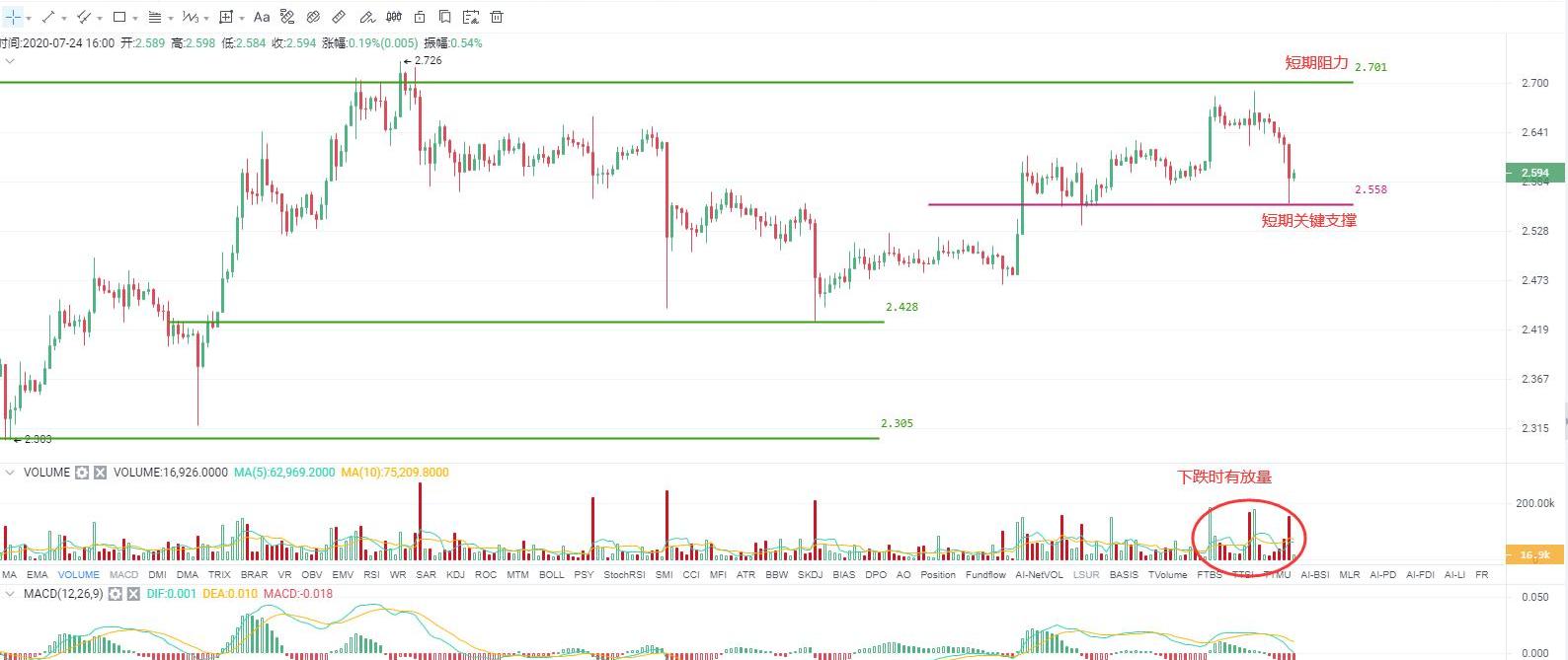 主觀預期:預估未來兩天幣價主要在2.56-2.7區間的下半部分波動,而且有較大可能會短時間破位2.56,不過出現單邊下跌概率不大。本段不作為交易策略參考。