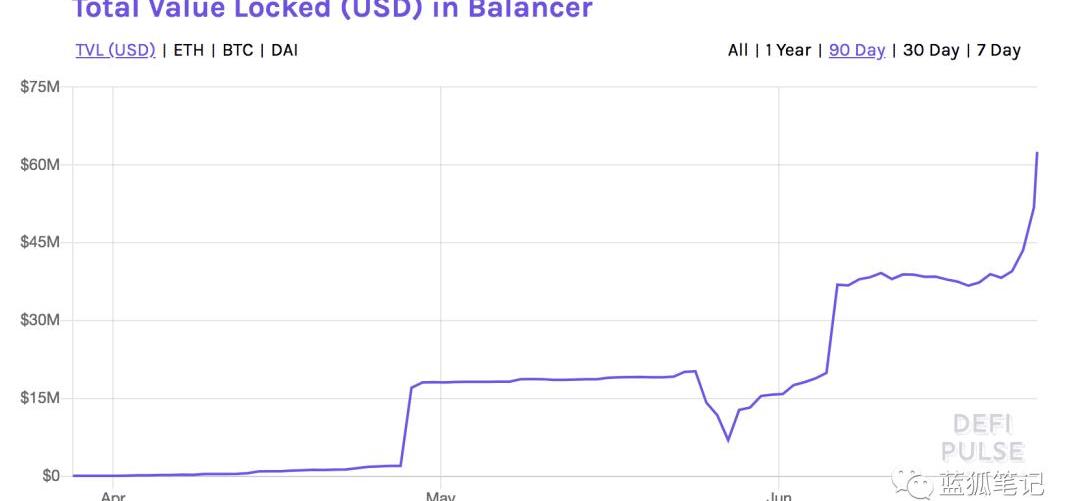 在三個星期之前的6月初,BAL推出了流動性提供商的挖礦計劃,其流動性出現第一次大的爬升,具體見下圖。第二次大的爬升是今天,上漲了41.6%,預計未來幾天還會有增長。就流動性而言,Balancer已經基本上跟Uniswap持平,Uniswap當前的流動性為6300多萬美元。