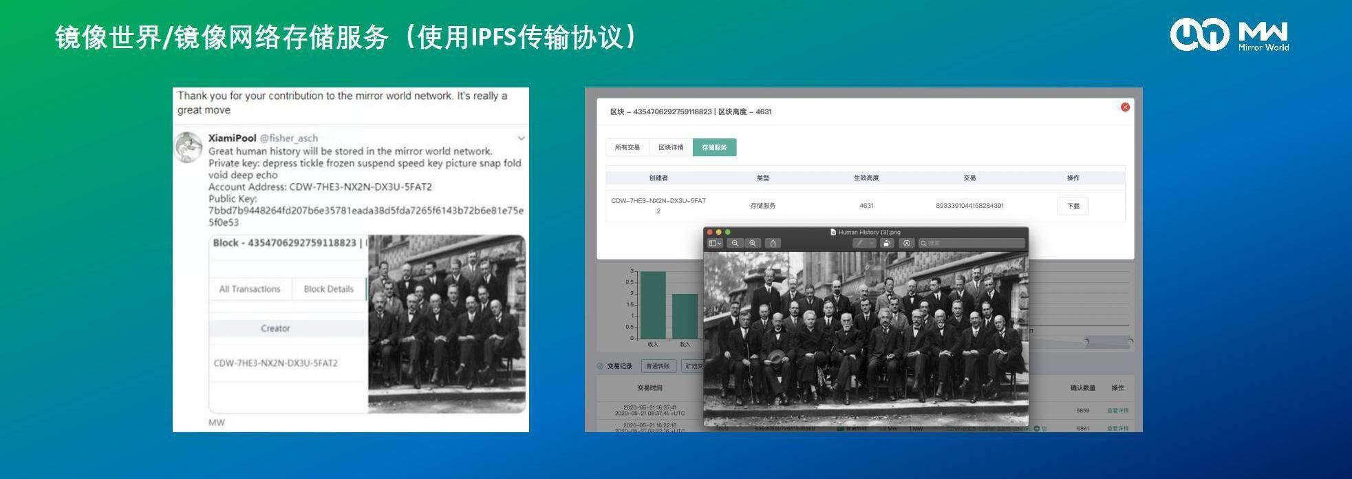 我們做了公有鏈的技術之后,需要處理存儲問題。5月21號,即網絡上線一個月時,已有用戶到我們網絡使用存儲服務。這是1927年比利時賽爾威爾會議的一張珍貴照片,里面有愛因斯坦、居里夫人、薛定諤等諾貝爾物理學獎的獲得者。這也是用了IPFS傳輸的協議去存儲,這張照片會永遠存在在網絡里,哪怕斷電斷網,這也是IPFS的魅力之一。