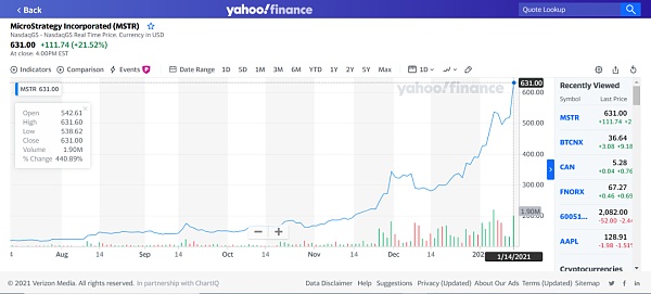 它是一家納斯達克上市公司,買入比特幣前,股價在120美金左右,而現在,它的股價創造了631美金的歷史新高。