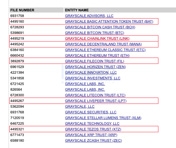 同時,該網站也顯示了灰度現有的同名信托實體,包括「GRAYSCALE BITCOIN TRUST (BTC)」、「GRAYSCALE BITCOIN CASH TRUST (BCH)」、「GRAYSCALE ETHEREUM CLASSIC TRUST (ETC)」、「GRAYSCALE ETHEREUM TRUST (ETH)」、「GRAYSCALE HORIZEN TRUST (ZEN)」、「GRAYSCALE LITECOIN TRUST (LTC)」、「GRAYSCALE STELLAR LUMENS TRUST (XLM)」、「GRAYSCALE XRP TRUST (XRP)」、「GRAYSCALE ZCASH TRUST (ZEC)」。