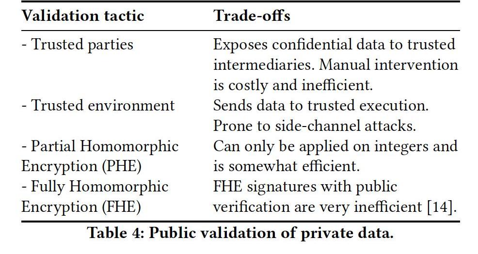 可審計性還適用于審計私有數據和事務的有效性,這涉及元數據,例如特定于應用程序的事務的順序。我們的研究強調,私有數據驗證可以通過使用第三方驗證器、可信執行以及利用同態加密和零知識證明等技術來實現。然而,這些方法的性能和實際應用目前僅限于應用算法和加密數據。