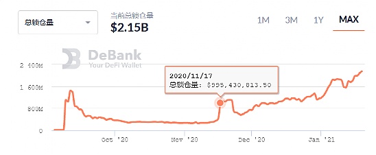 據Debank數據,在去年11月,Sushiswap平臺的總鎖倉量迎來了迅猛的增加,從此前的3億美元左右一躍漲到最高10億美元。