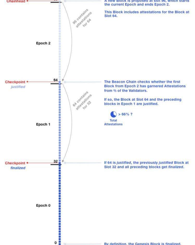 一個時段邊界區塊(EBB)在slot96處被提議,且包含了對epoch2中檢查點的證明。Epoch2檢查點的證明投票現達到了2/3的絕對多數,這意味著epoch2的檢查點被證明了,因此epoch1的檢查點也得到了最終性。slot32的最終性保證了之前所有區塊的最終性。當對檢查點進行確定時,對確定的區塊的數量并沒有限制。雖然最終性僅在時段邊界的時候產生,但證明(attestations)是逐個區塊累加的,下文的“從創世區塊到區塊鏈頭會發生什么”提供了另一種描述。從slot1到slot32的信標塊中包含的所有交聯將導致分片鏈的確定。換句話說,當一個分片區塊被交聯到一個完成的信標塊中時,它就得到了最終性。交聯本身不足以使分片區塊被確定,但有助于分片鏈的分叉選擇。