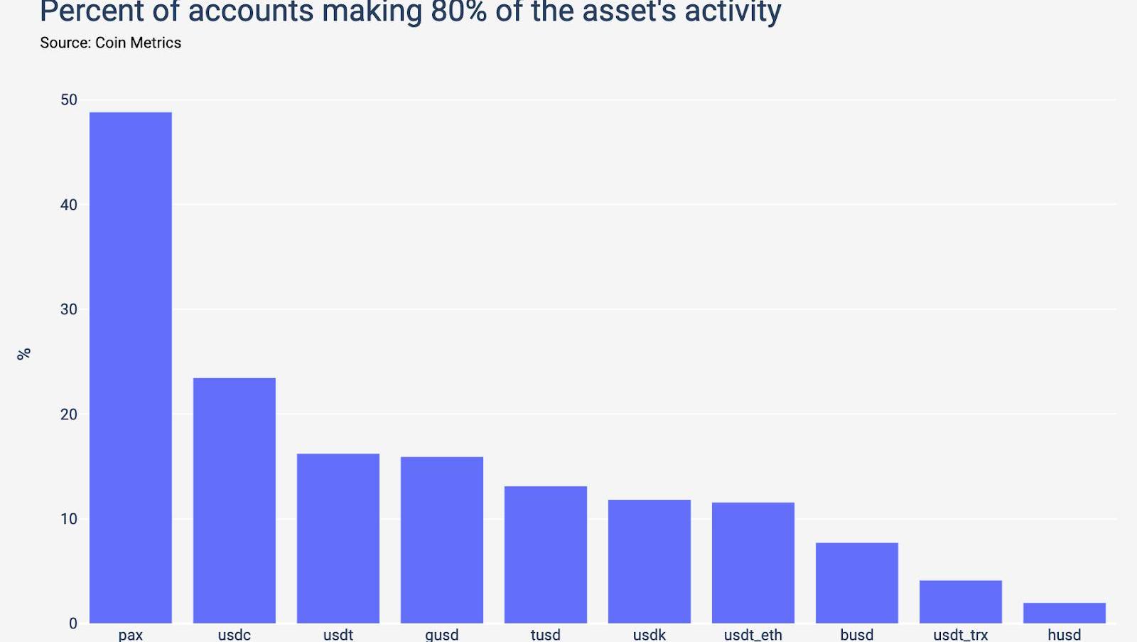 另一種比較穩定幣的方法,是看有多少賬戶在負責大部分鏈上活動。如果只有一小部分賬戶負責大部分交易,則表明這種穩定幣除了在少數交易所之外,缺少使用。