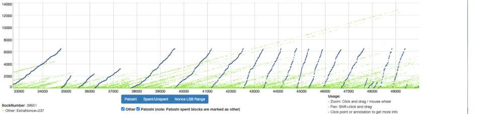 消息一出,引起了大家的廣泛猜測,從2013年開始,就一直有人想要去追蹤中本聰所挖到的塊,而Sergior這個人基于幾種方法的判定,通過可視化的數據,基本確定了疑似中本聰區塊的大概分布情況,我們也在這里統稱中本聰區塊為PatoshiBlocks。