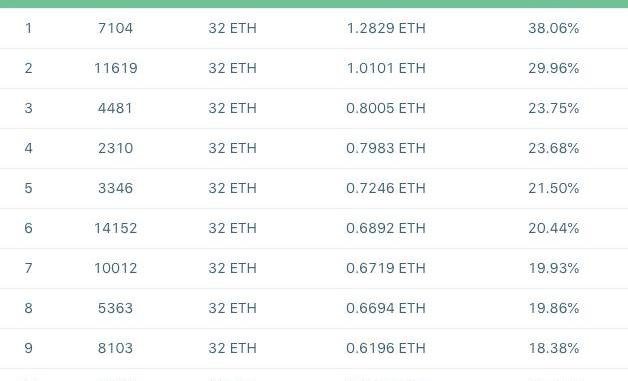 根據以太坊瀏覽器Etherscan信標鏈的測試網數據,可以看到Staking收益率排名第一的驗證人年化收益率可以高達38.06%,而排名第十的驗證人年化收益率為18.15%,差額將近一倍。