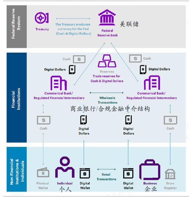 數字美元采用與DC/EP如出一轍的雙層運營體系。相對于JPMCoin和Libra等由企業發行的錨定法幣的數字通證,數字美元基金會提議由美聯儲發行數字美元,再分發給各商業銀行和受監管的金融中介機構,再由它們分發到個人和企業的數字錢包。雖然美聯儲尚無計劃發行數字美元,但未來時機成熟時美聯儲有可能將數字美元直接納入美元體系中。