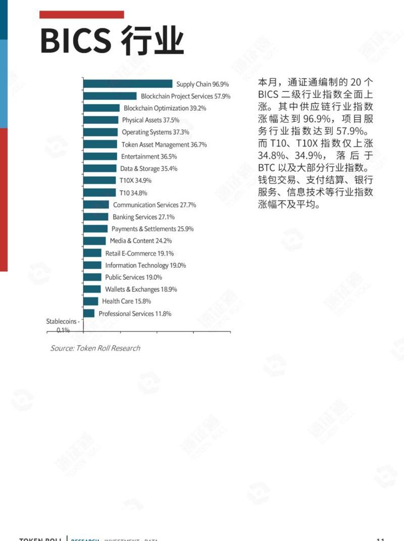 本月,通證通編制的20個BICS二級行業指數全面上漲。其中供應鏈行業指數漲幅達到96.9%,項目服務行業指數達到57.9%。而T10、T10X指數僅上漲34.8%、34.9%,落后于BTC以及大部分行業指數。