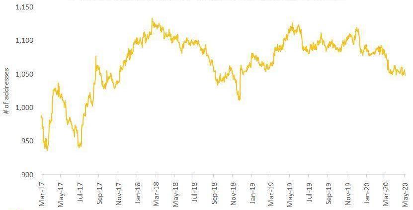 本周二,持有10000枚及以上ETH的地址數量的7天平均值降至1050個,比12月的高點下降了近6%。根據Glassnode數據顯示,這是自2019年1月以來的最低水平。