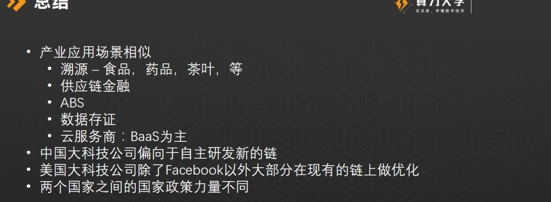 中國大的科技公司都偏向于自己研發自己的區塊鏈,而美國除了Facebook以外開發自己的鏈比較少,當然兩個國家之間的國家的政策力量都是不同。