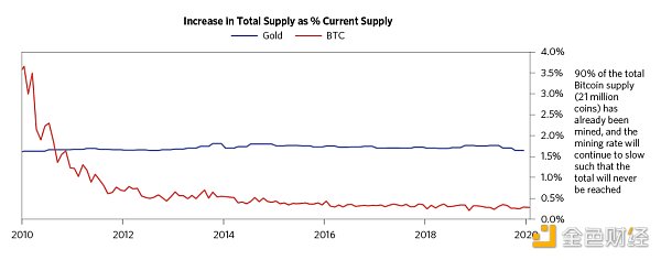 BTC與黃金相似,如果作為直接交換商品和服務的媒介,其用途有限。然而,BTC也有黃金的優勢,比如有限且穩定的發行量,不會因央行增發而貶值。根據BTC的代碼,其總供應量為2100萬枚,發行率每隔幾年自動減半。正是比特幣的這一特性,產生了“數字黃金”的說法。如下圖所示,雖然最初幾年BTC的發行率較高,但現在的供應增長率低于黃金。