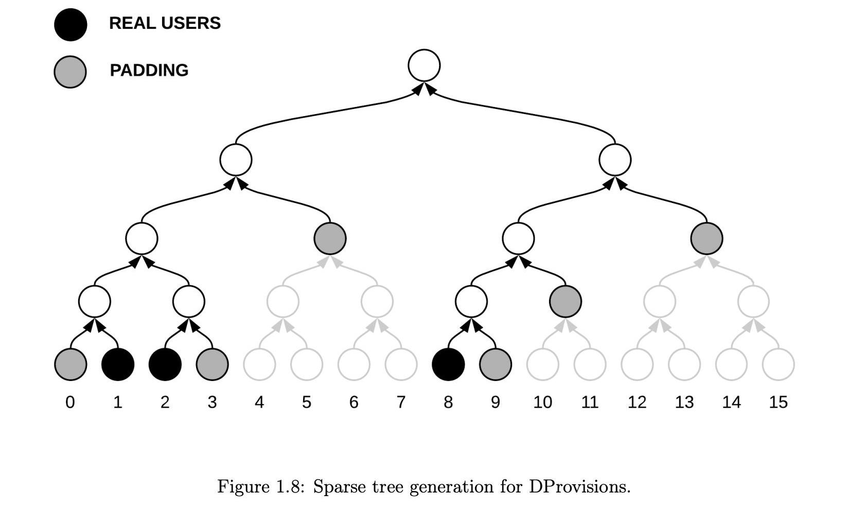 DProvisions的另一個特點是它使用稀疏的Merkle樹,目的是在需要填充時最小化偽用戶。注意,填充可以幫助混淆用戶群的總體大小。如圖1.8所示,只需要對空子樹的根進行填充,因此,我們可以輕松地支持以前不可能的樹高。值得注意的是,樹的高度顯示了最大的用戶數,因此,高度為40的樹可能可以支持當今的大多數應用程序。實際上,你可以選擇一棵足夠大的樹,即使在最有希望的預測場景中,它也能在未來的x年內工作,因此樹的大小永遠不需要更新;如果更新了,它可能會顯示出一些變化,即更多的用戶進入系統。