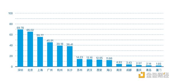 第二梯隊中,各城市區塊鏈發展指數與安全指數較為平衡,差距較小。上海市作為中國的金融中心,持續推動區塊鏈和金融的結合打造了金融科技的一大想象空間;此外,上海正全力推動以區塊鏈技術全面賦能實體經濟的發展,在楊浦、靜安等區形成產業集聚,擁有了一批區塊鏈技術研發企業。深圳市高度重視區塊鏈技術創新和產業布局,通過政策護航、重點突破,在區塊鏈應用領域已經形成多點開花,集群式發展的盛況,走在了全國前列,在區塊鏈的“新賽道”上,改革開放的前沿陣地深圳正不斷深化布局、推動應用,致力成為區塊鏈全球產業鏈技術鏈的高地。廣州作為國家重要中心城市,在區塊鏈領域擁有良好基礎,并持續保持國內支持力度最大、模式突破最強的區塊鏈產業扶持政策,牢牢把握區塊鏈發展新階段的戰略主動,在起跑線上贏得主動權,計劃建成中國區塊鏈數字經濟創新區。杭州作為國內最早一批關注和布局區塊鏈的城市,杭州政府方近年來對區塊鏈技術和產業的發展給予了大力扶持,區塊鏈發展水平始終穩居國內行業發展前列。長沙加快推進區塊鏈產業發展壯大,持續出臺多想區塊鏈扶持政策,驅動區塊鏈產業集聚、規模擴大、應用落地;緊跟北上深廣杭,創新能力初步顯現,項目應用場景逐步增多,已呈現集聚發展態勢。