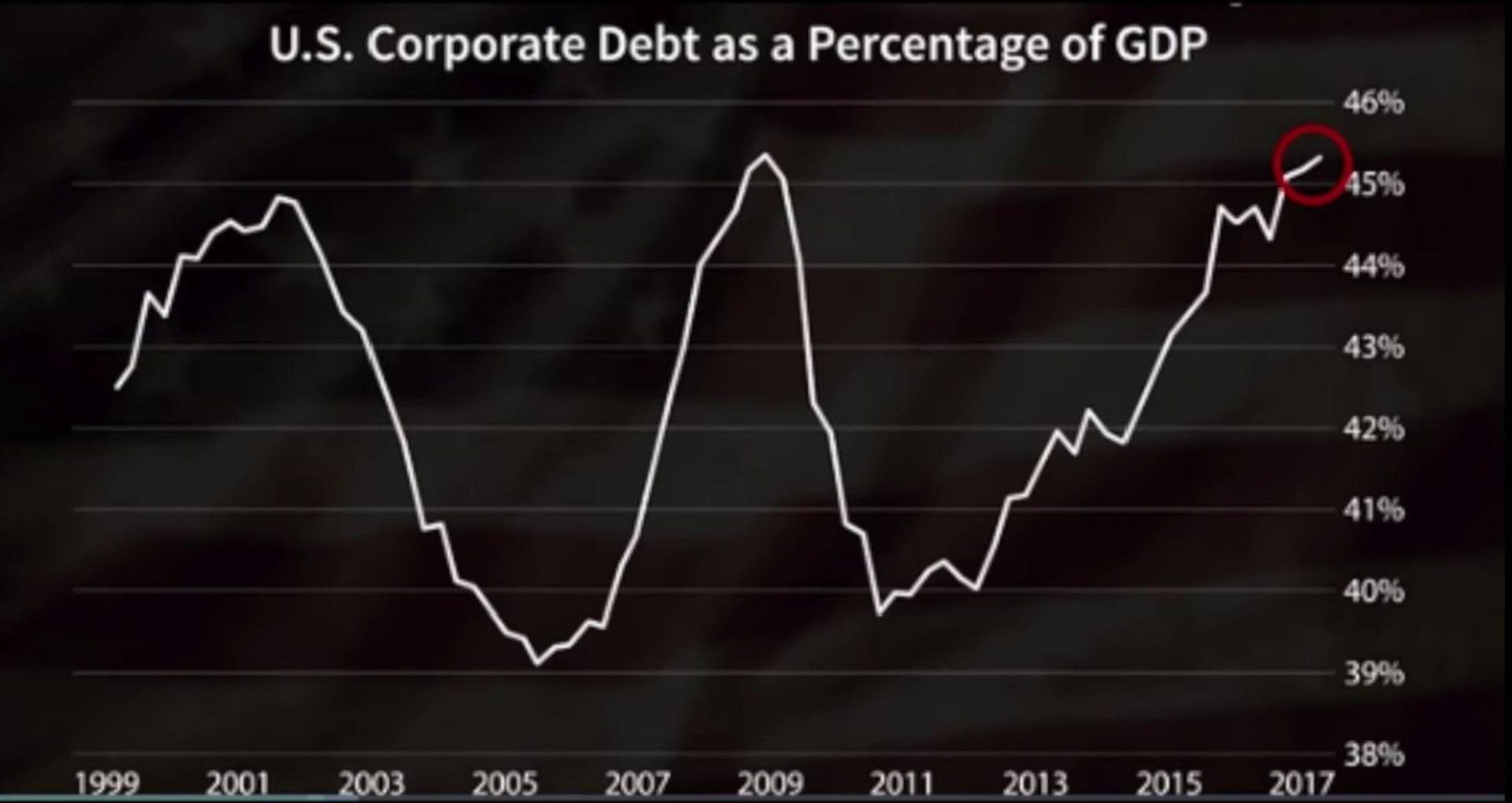 長期大手筆借債,導致美國上市公司債臺高筑,整個美國上市公司公司債水平也達到了美國GDP的近50%。