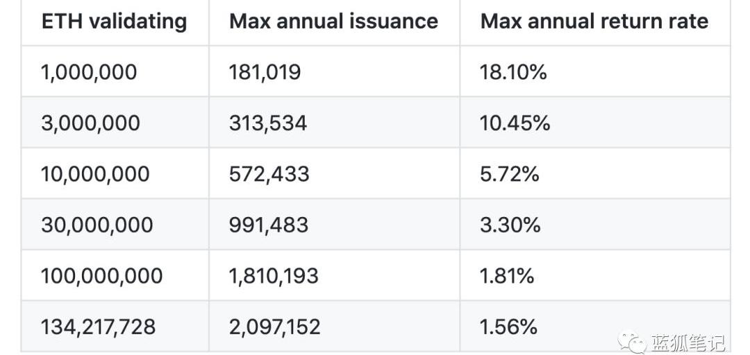 為了降低到這個水平,它意味著在ETH2.0驗證者中將鎖定大約1000-3000萬的ETH。在ETH2.0的早期階段,這些ETH是無法退出的。因此,在開始啟動時,我們可能會看到較低的投資和較高的利率。
