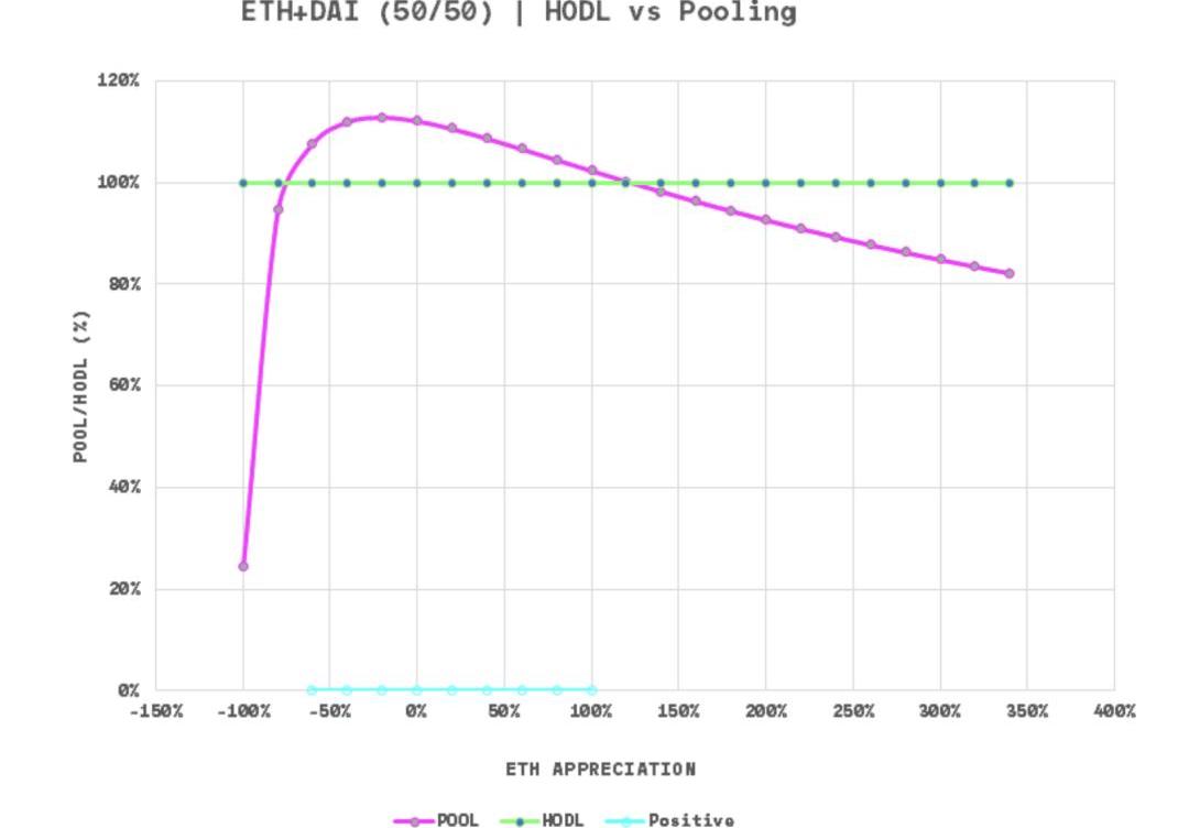 我們看到,和單純持有加密資產相比,池聚策略的表現可能好于或差于買入并持有策略,這主要取決于價格變化,以及交易額/資金池規模的比值。