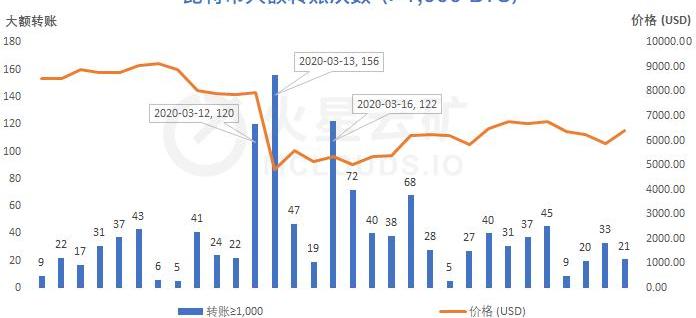 3月12日、13日比特幣暴跌至最低3800USDT,期間共發生了276筆超過1000BTC的大額轉賬,是自2019年8月以來最高記錄;近一年來,單日大額轉賬最高的是2019年3月3日,350筆;2019年6月29日,309筆;2019年7月12日,300筆;2019年4月25日,269筆。