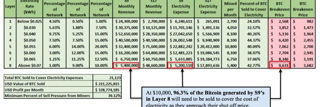 有許多低效的,老一代的挖礦平臺正在挖掘比特幣(3-8層運行S9的)。這些礦商對比特幣的出售壓力最大,因為他們開采的比特幣大部分需要出售,以支付電費。3-8層的礦商,運行S9的礦商也有最高的盈虧平衡價格。它們代表了當前采礦網絡中對比特幣價格造成下行壓力的壓力點。