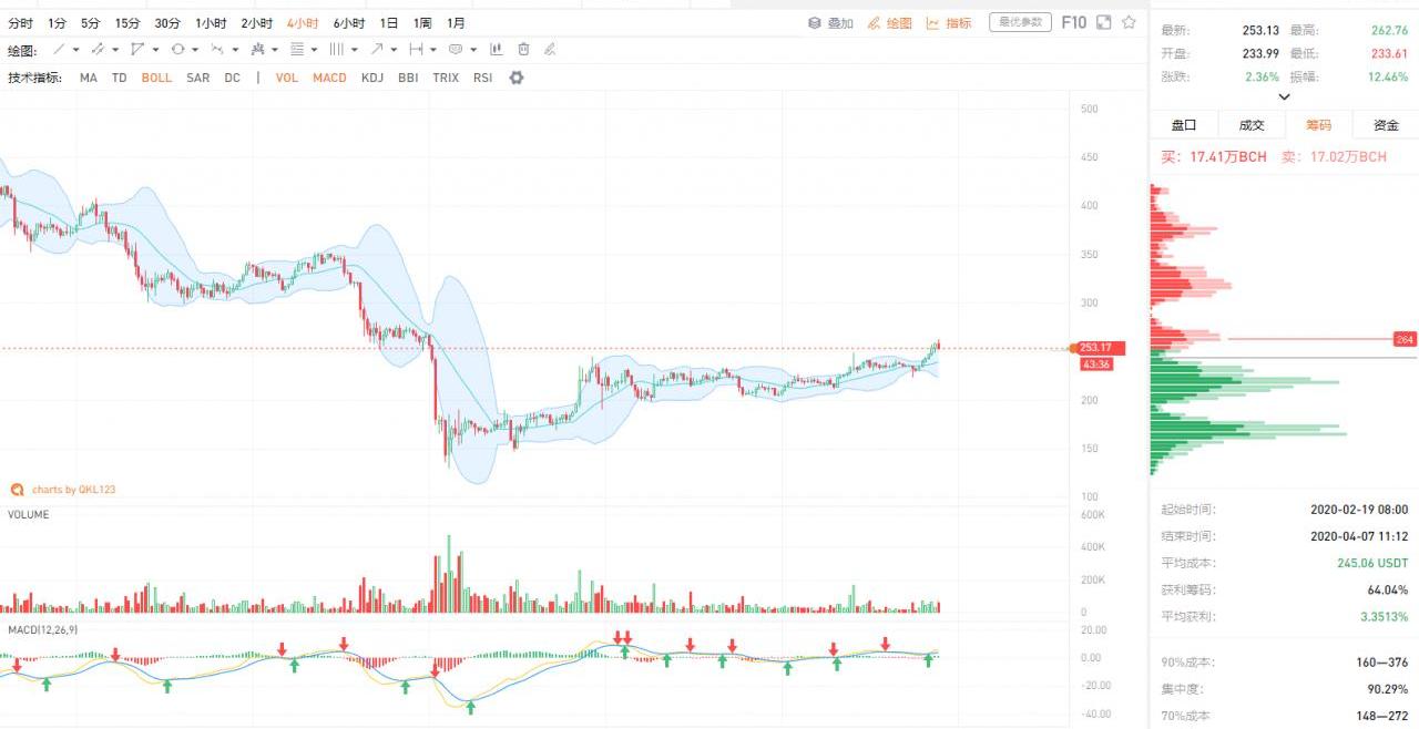 昨日下午BTC開始快速拉升,短時伴有小幅的明顯放量,成功站上7000美元,上方空間看到7800美元的籌碼集中區域。目前,山寨幣漲幅較大,相對比特幣明顯強勢,說明市場形成一致看漲預期,后續會有一定的慣性上揚,但短時臨近超買,可能會有所回調。疊加全球疫情放緩預期和比特幣區塊減半預期利好,近期有望走出一波行情。